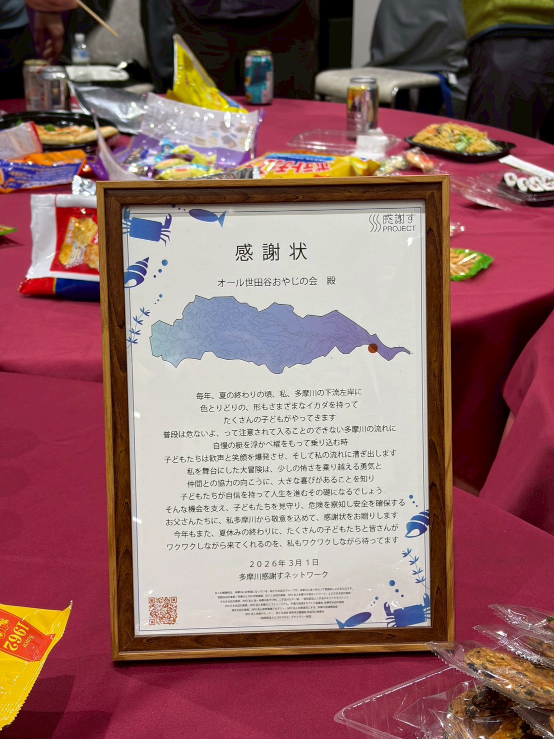 当日、エコロジカル・デモクラシー財団の土肥代表から多摩川への取り組みを評価した表彰状をいただきました。